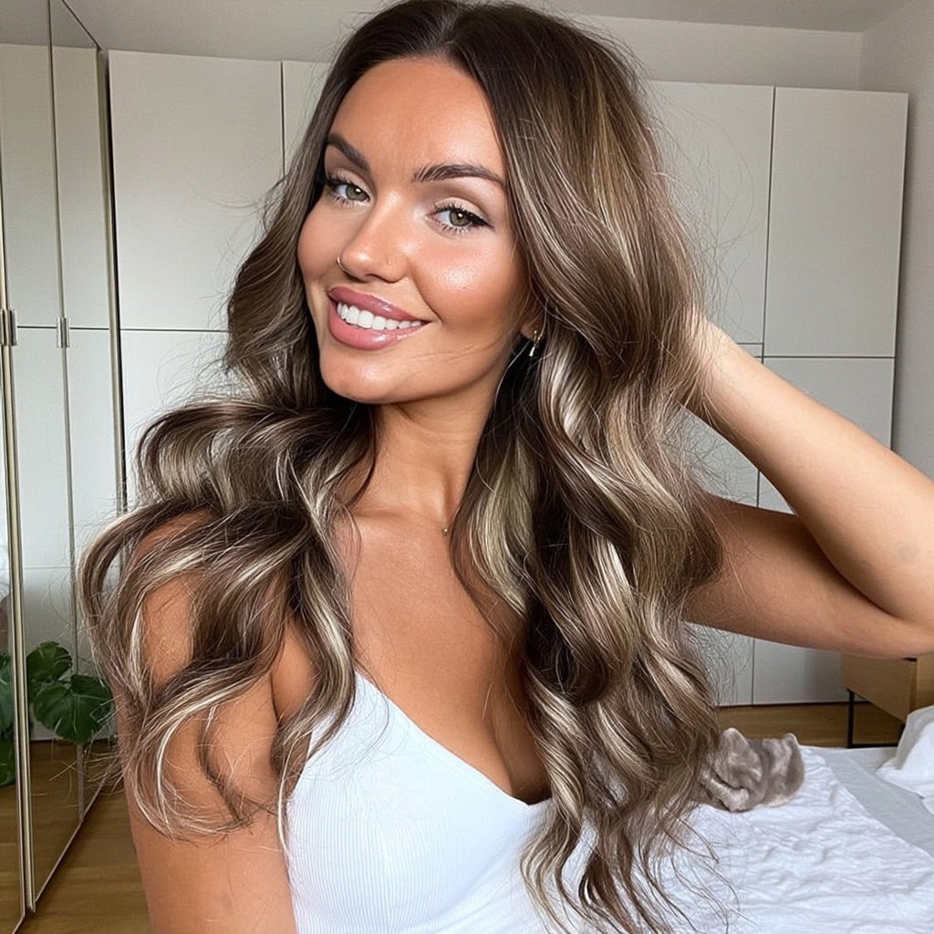 Long Brown Human Hair Blend HD Lace Front Wig (13x4) Blonde Highlights - Leena