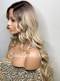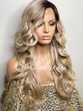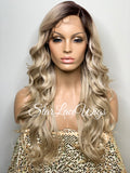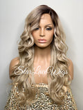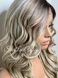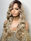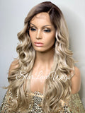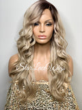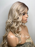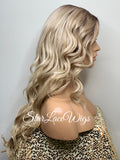 Long Blonde Lace Front Wig Bangs Wavy Synthetic Dark Roots Layers Side Part - Raquel