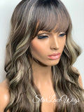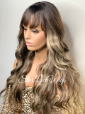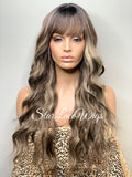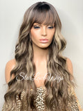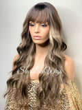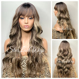 Long Wavy Brown Wig Center Part Blonde Highlights Bangs - Tiffany