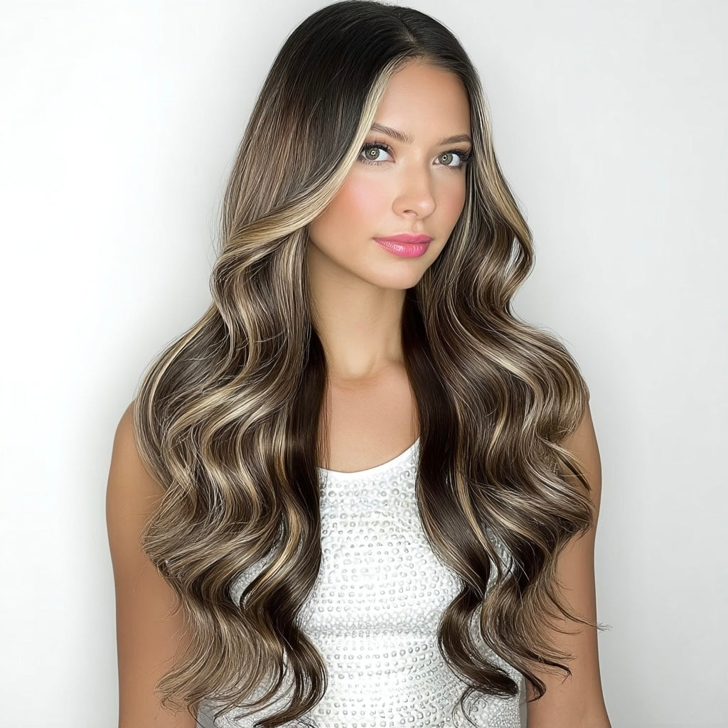 • Long Brown Blonde Highlights Human Hair Blend HD Lace Front Wig (13x4) - Jennifer