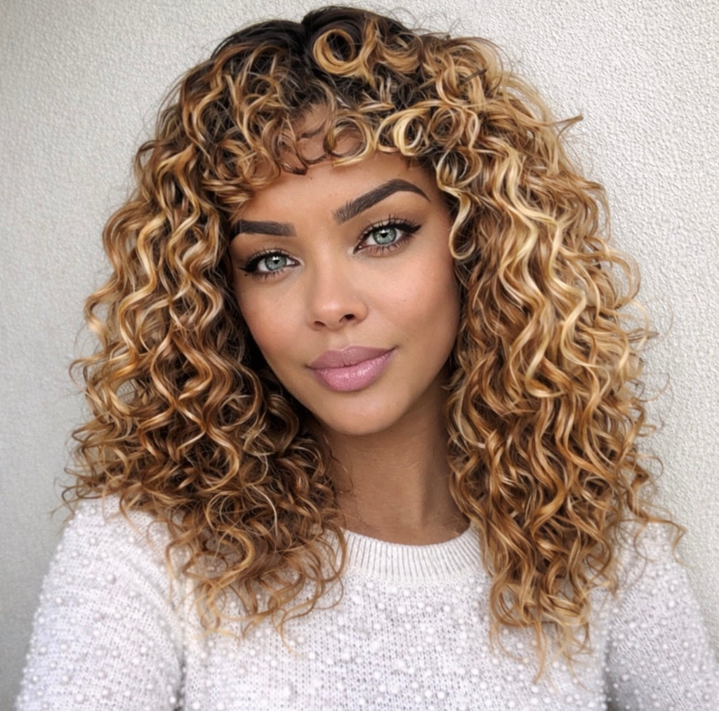 Curly Blonde Mix Dark Roots Bob Wig Bangs - Katrina